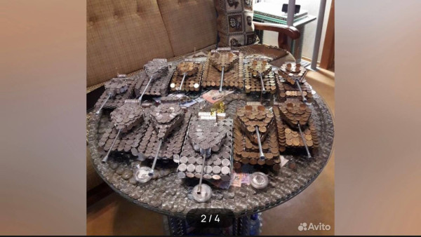 В Самаре появилось необычное предложение для любителей военной истории – местный коллекционер выставил на продажу уникальную коллекцию из 11 танков, полностью собранных из советских и российских монет номиналом от 1 копейки до 1 рубля. Цена металлической мечты нумизмата поражает воображение – 290 миллионов рублей.