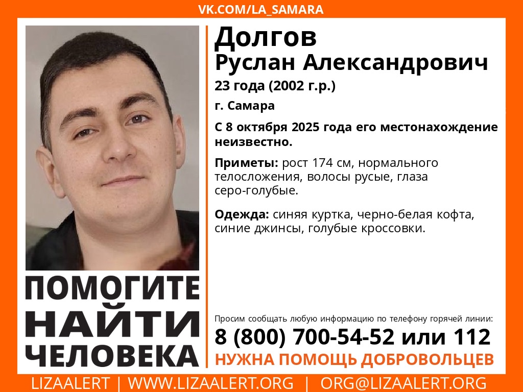В Самаре ищут Руслана Долгова, двадцати трех лет. Парень исчез 8 октября, и с тех пор о его местонахождении ничего не известно. Об этом пишет Поисковый отряд "ЛизаАлерт".