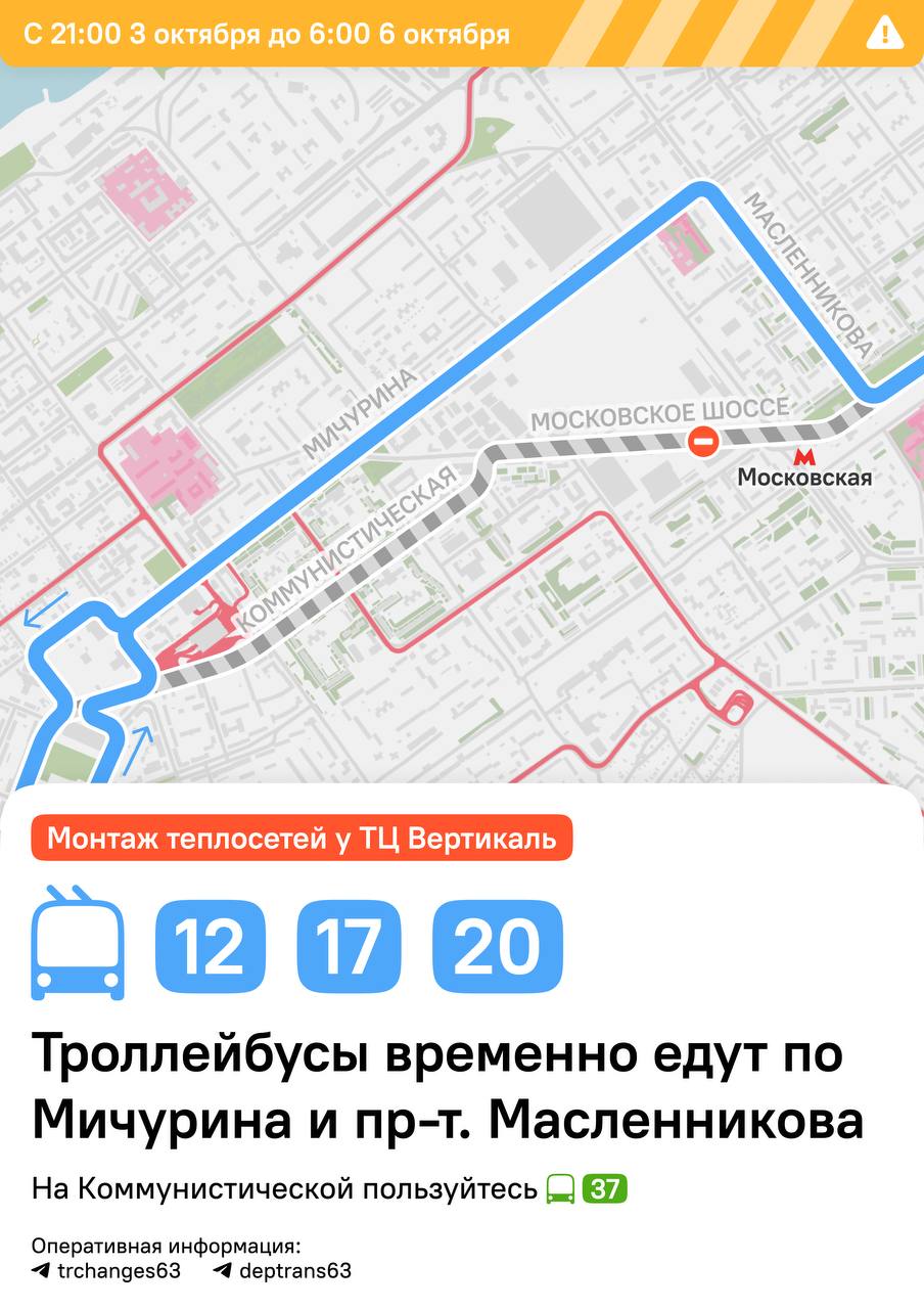 "Троллейбусы 12, 17 и 20 временно едут по Мичурина и проспекту Масленникова", - сообщили в городском департаменте транспорта.