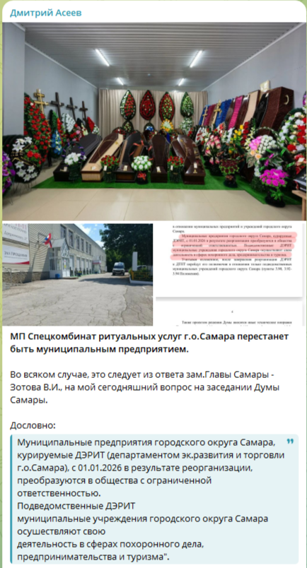 С 1 января 2026 года муниципальное предприятие «Спецкомбинат ритуальных услуг» официально станет обществом с ограниченной ответственностью. Об этом сообщил заместитель главы Самары Владислав Зотов в ответе на запрос депутата Дмитрия Асеева на заседании Думы Самары.