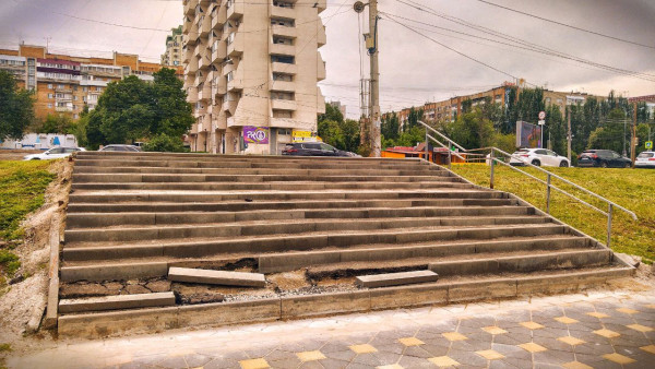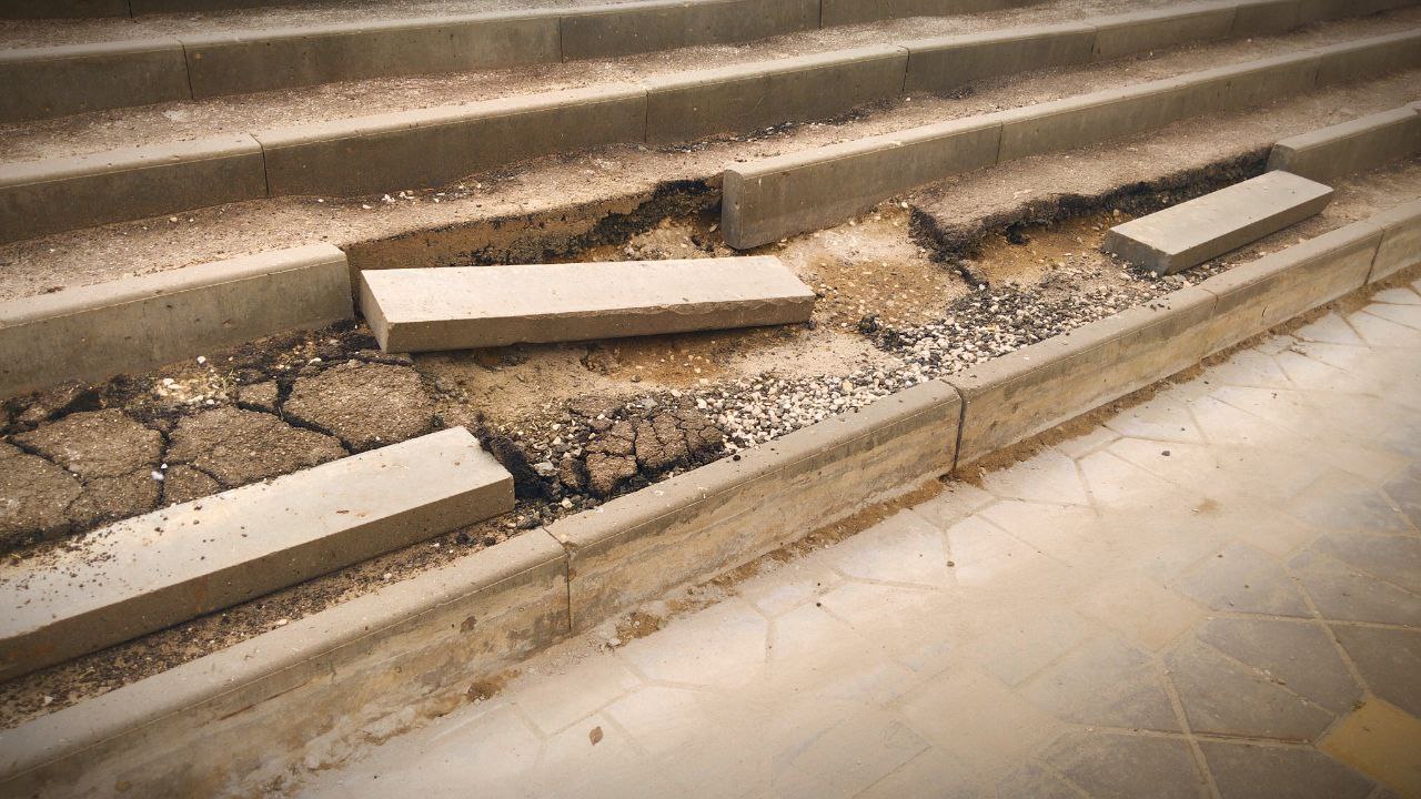 После недавнего ремонта конструкции, прилегающие к лестничному спуску, буквально развалились. Каменные бордюры, призванные удерживать форму и безопасность, не выдержали — и вместе с ними ушла в осадок и часть лестницы. Горожане и туристы с удивлением смотрят на объект, недоумевая: "Кому в голову пришло нагородить такое из бордюров и асфальта?!"