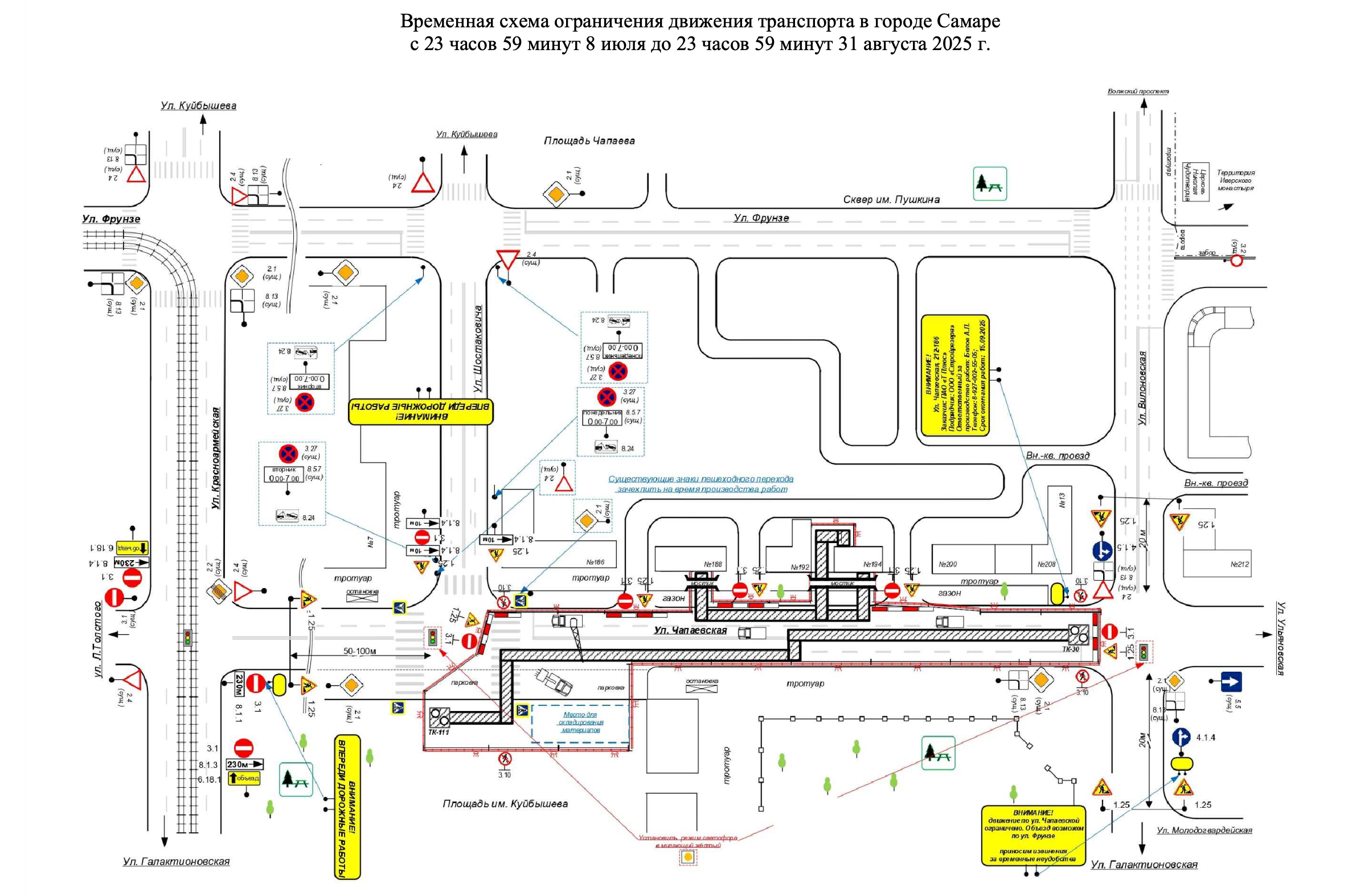 Перекрытия затронут улицу Чапаевскую. С 23:59 8 июля до 23:59 31 августа будет ограничено движение транспорта в районе дома № 210, на участке от улицы Вилоновской до улицы Шостаковича. Автомобилистам рекомендуется использовать для объезда перекрытого участка улицу Фрунзе, а также прилегающие улицы.
