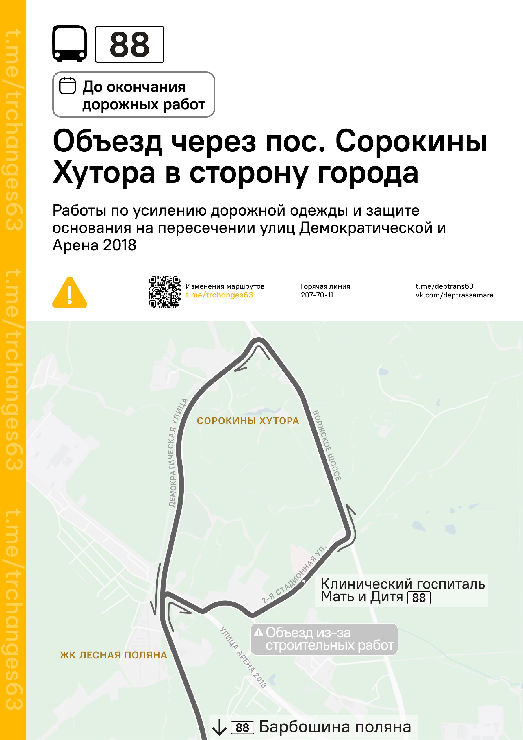 В Самаре временно меняется движение автобусов по маршруту №88. Это связано с тем, что на перекрестке улиц Демократической и Арены-2018 будут проводить важные дорожные работы. Специалисты планируют укрепить дорожное покрытие и защитить его основу.