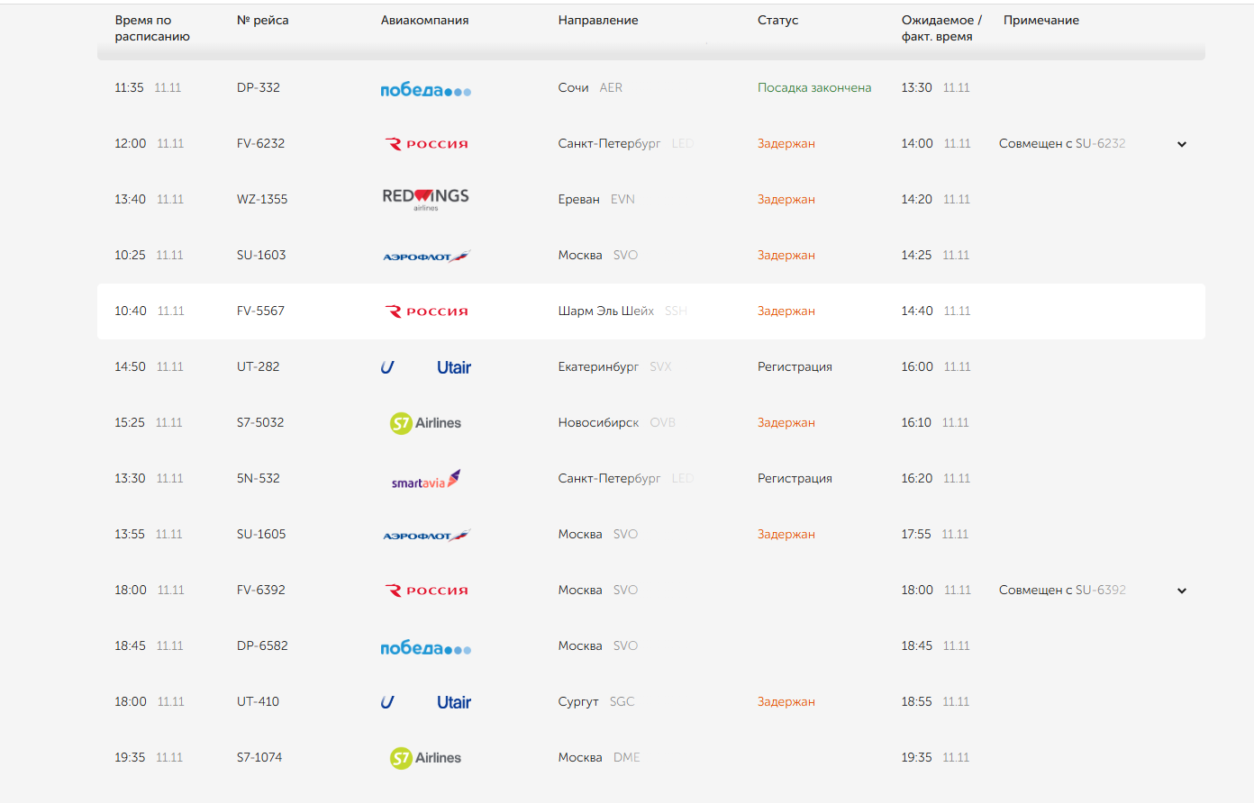 По данным онлайн-табло, с вылетом позже графика отправились несколько направлений: