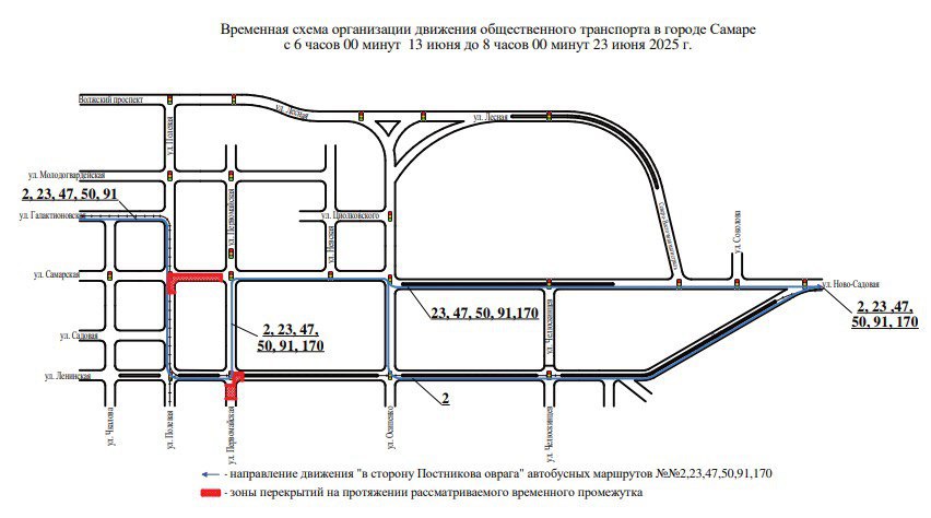 С 06:00 13 июня до 08:00 23 июня автобусы, ранее двигавшиеся по проспекту Ленина напрямую, изменят маршрут. При отправлении от улицы Полевой они будут сворачивать на Первомайскую, затем спускаться до Ново-Садовой и выходить на прежний путь с Осипенко. Это коснётся автобусов №№2, 23, 47, 50, 91 и 170.