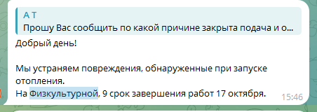 Сначала жители дома обратились напрямую в чат "Т Плюс", где получили ответ от управляющей компании — работы будут завершены 17 октября.