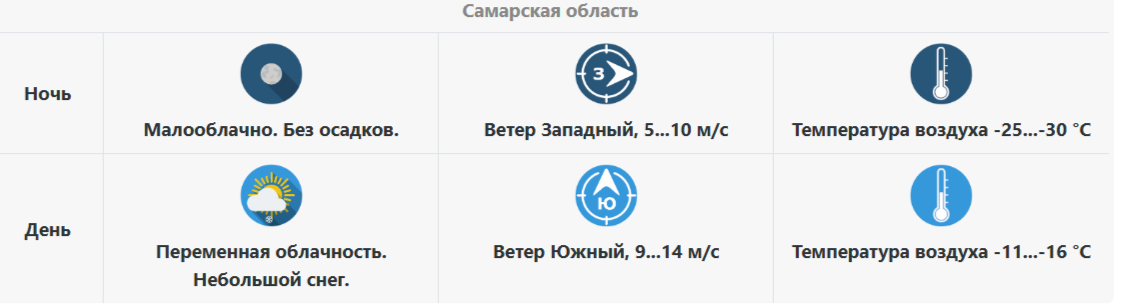 Днем характер погоды изменится. Прогнозируется переменная облачность и небольшой снег. Ветер сменит направление на южное и усилится до 9–14 метров в секунду. Воздух днем прогреется до -11…-16 градусов.