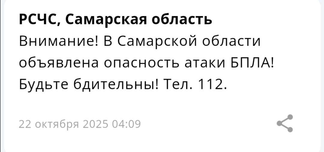 В Самарской области ночью 22 октября была объявлена угроза атаки БПЛА. Сообщение пришло от МЧС около 4 часов утра. Граждан призвали быть внимательными и осторожными.