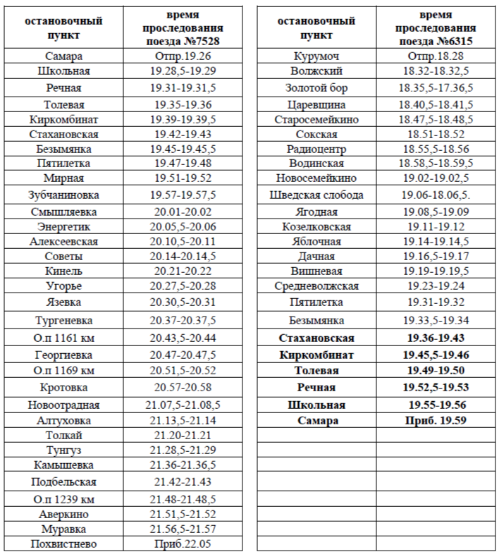 - А поезд № 6316, курсирующий по направлению Курумоч (отправление в 18:28) – Самара (прибытие в 19:53), на участке от станции Стахановская до Самары, будет следовать с изменениями в графике: Курумоч (отправление в 18:28) – Стахановская (19:36-19:43) – Самара (прибытие в 19:59).