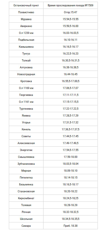 - В частности, электропоезд № 7528, следующий по маршруту Самара (отправление в 19:34) – Похвистнево (прибытие в 22:13), будет курсировать по скорректированному расписанию: отправление из Самары в 19:26, прибытие в Похвистнево в 22:05.
