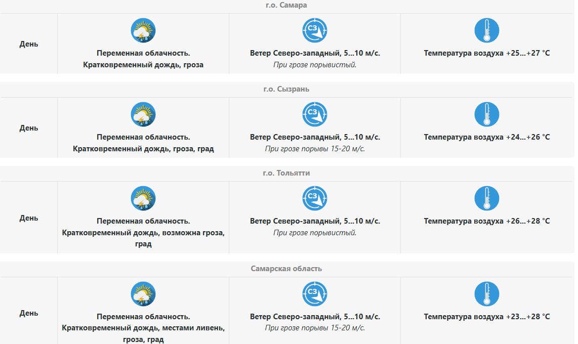 В целом по Самарской области ожидается нестабильная погода с ливнями и грозами, местами возможен град. Атмосферный фронт сопровождается резкими порывами ветра — особенно опасно находиться вблизи деревьев, рекламных конструкций и на открытых пространствах. Температура воздуха — +25…+27 °C.
