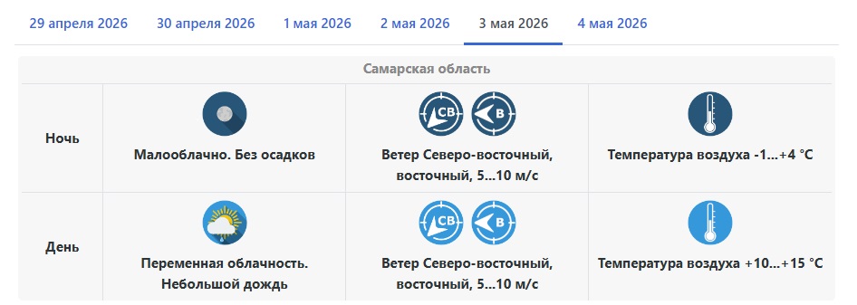 В ночь на 2 мая, в субботу, температура опустится до 0…+5 °C. Днём синоптики обещают +9…+14 °C. В тёмное время суток местами пройдёт небольшой дождь, а светлое время, скорее всего, обойдётся без осадков.