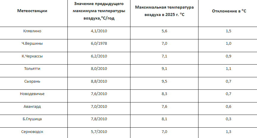Наиболее значительные отклонения от прежних максимумов наблюдались в Серноводске, где температура составила 7,0°C (предыдущий рекорд – 5,7°C в 2010 году), и в Клявлино.