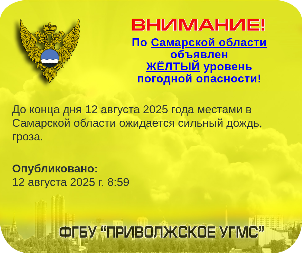 12 августа 2025 года на территории Самарской области ожидаются опасные погодные явления – сильный дождь и гроза. Согласно данным ФГБУ «Приволжское УГМС», в регионе объявлен желтый уровень опасности.