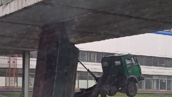 В автограде частенько случаются интересные случаи, связанные с машинами. Так, КамАЗ кузовом зацепил переход Автоваза и встал на дыбы.