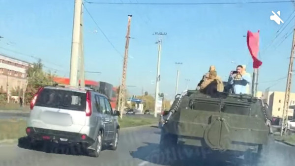 Кадры появились в социальных сетях. На них видно, как в потоке машин едет настоящий бронетранспортер. Автор ролика явно удивлен происходящему средь бела дня. В голосе мужчины слышна мальчишеская радость от того, что буквально в нескольких метрах от него он увидел военную технику.