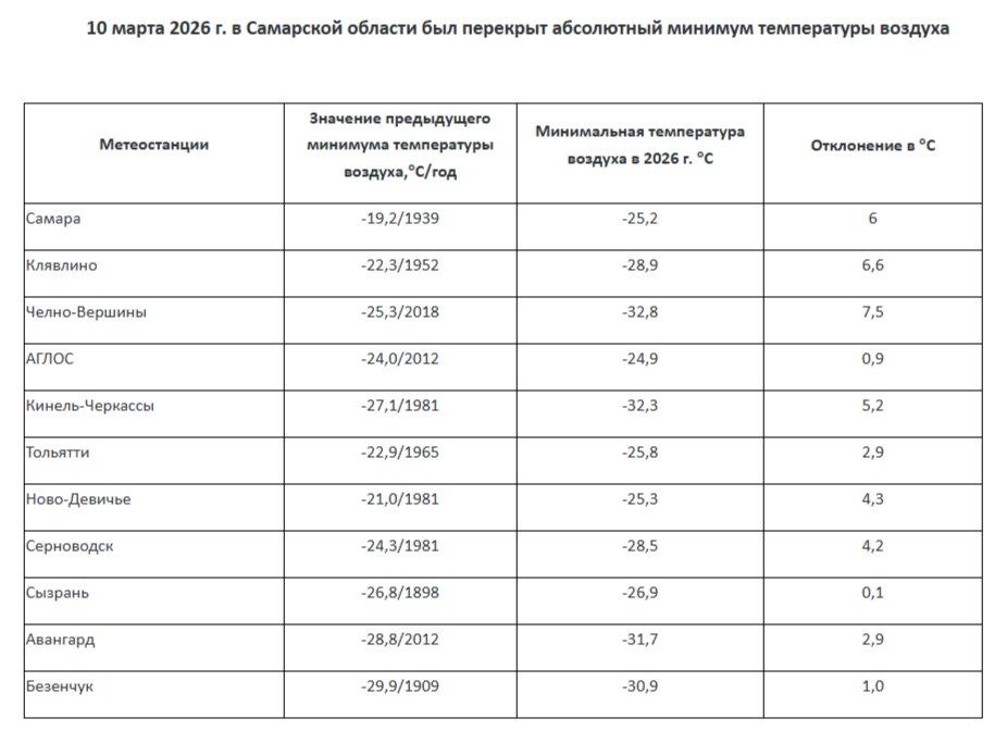 Во вторник, 10 марта 2026 года, Самарская область вошла в историю метеонаблюдений. Арктический антициклон, накрывший регион в начале недели, привел к обновлению вековых температурных рекордов сразу в нескольких городах.