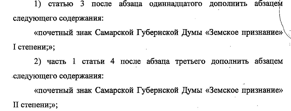 В документе, опубликованном на сайте регионального правительства, говорится, что жителям будут вручать награду «Земское признание» I и II степеней. Это почетный знак Самарской Губернской Думы.