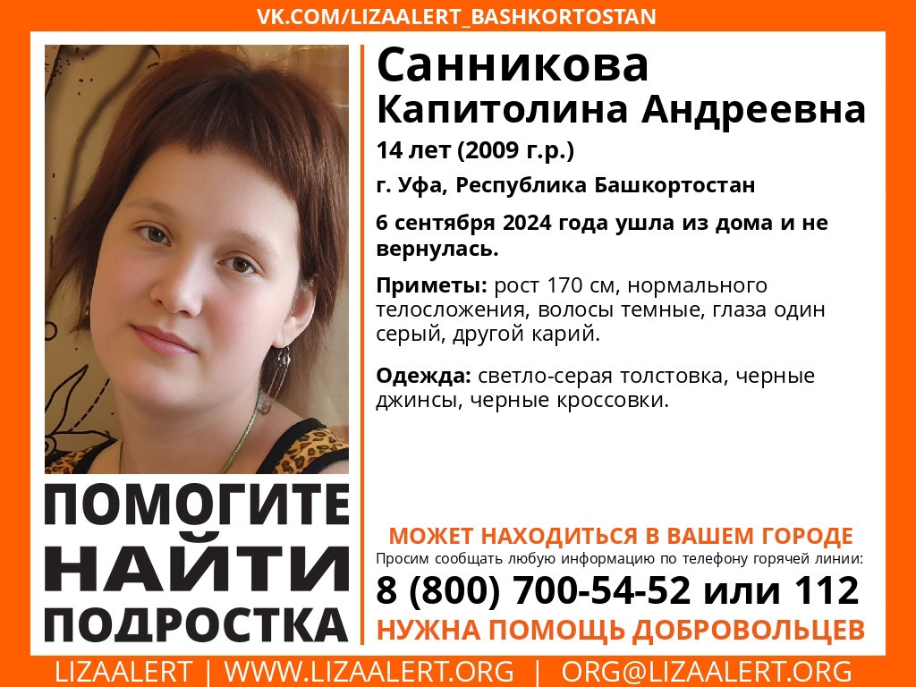 "Внимание! Может находиться в нашем регионе!" - такое обращение распространили в социальных сетях волонтёры-поисковики. 6 сентября этого года из дома в городе Уфа ушла 14-летняя девушка, до сих пор она не подавала о себе знать и никто не понимает, где сейчас она находится. Подростка зовут Санникова Капитолина Андреевна.