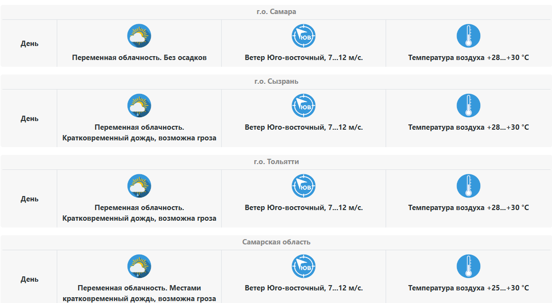 По данным Приволжского УГМС, в Самарской области в целом 21 июля будет переменная облачность, местами пройдут дожди с грозами, но сильных погодных явлений не прогнозируется. В Самаре осадков не ожидается — день пройдет с переменной облачностью, ветер юго-восточный, 7–12 м/с. Температура составит +28…+30 °C. А вот жителям Тольятти и Сызрани синоптики советуют взять зонт, возможны дожди и грозы. В этих городах также сохранится юго-восточный ветер, 7–12 м/с, температура воздуха +28…+30 °C.