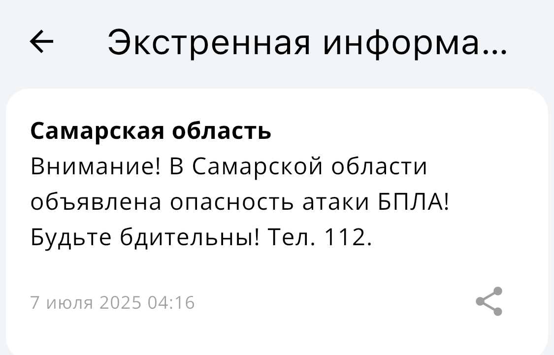 Рано утром, в понедельник, 7 июля в Самарской области в очередной раз была объявлена опасность атаки беспилотных летательных объектов. Сообщение от спасателей пришло в 4 часа 16 минут утра. Граждан призвали быть внимательными и при необходимости звонить по экстренному номеру 112.