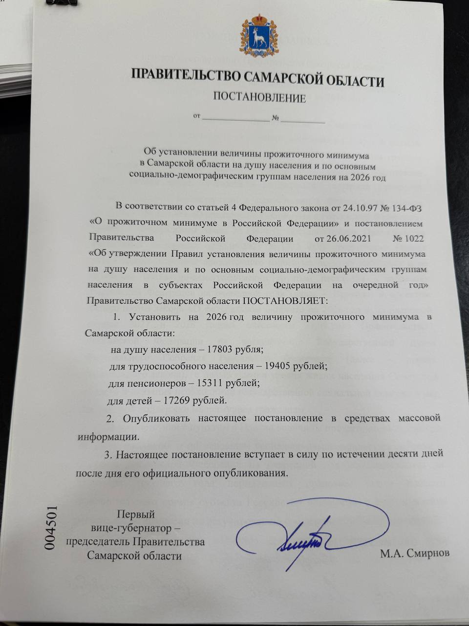 Правительство Самарской области приняло решение об увеличении прожиточного минимума на 2026 год. Соответствующее постановление подписал Председатель Правительства Самарской области Михаил Смирнов.