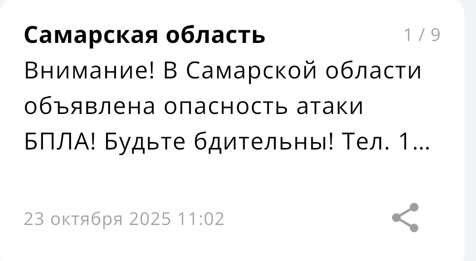 В Самарской области второй раз за день объявлена угроза атаки БПЛА 23 октября