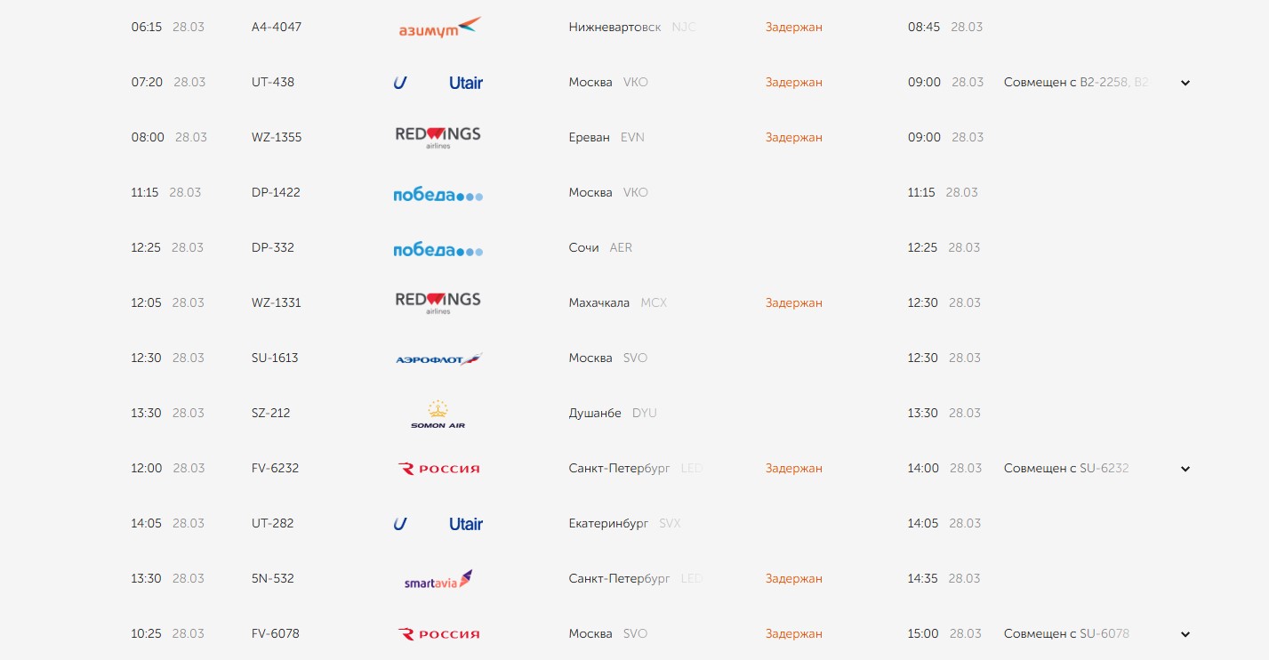 Судя по электронному табло самарского авиаузла, задержка вылета произошла у нескольких рейсов. На момент публикации данной статьи были отложены вылеты в Нижневартовск, Москву, Ереван, Махачкалу, Санкт-Петербург, Минеральные воды и Шарм Эль Шейх.