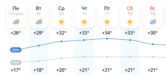 Согласно Яндекс.Погоде, пик жары придётся на конец недели, когда температура поднимется до +33…+34 °C. 7 и 8 июля будет немного прохладнее, но уже к 9 числу воздух прогреется до +32 °C. Ночью ожидается около +20…+21 °C и лёгкий северо-восточный ветер, около 2–4 м/с.