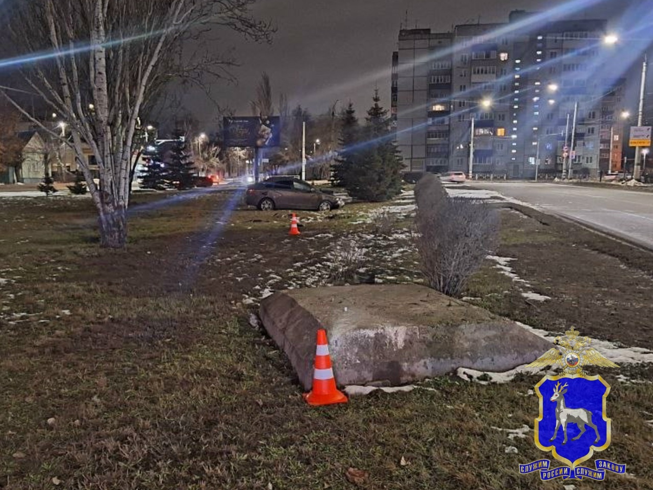 Не доезжая до перекрестка с круговым движением, у дома № 19, водитель утратил контроль над транспортным средством. Машина съехала с проезжей части на газон слева, относительно направления движения, где врезалась в препятствие (бетонный блок).