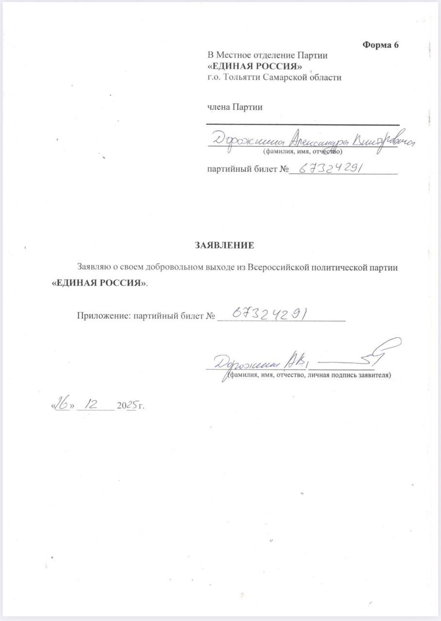В Тольятти депутат городской думы Александр Дорожкин вышел из партии «Единой России» из-за поста супруги.