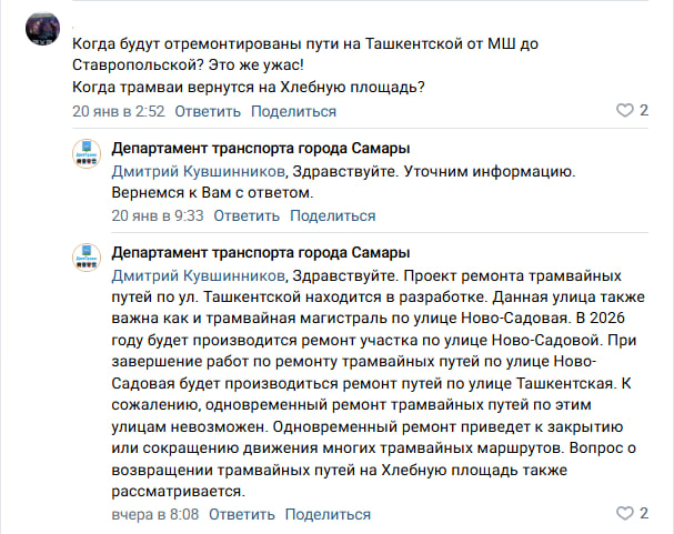 Жителей города интересовала не только судьба путей на самой площади, но и сроки ремонта трамвайной инфраструктуры на улице Ташкентской. В ведомстве пояснили, что проект ремонта путей на Ташкентской уже находится в разработке. Однако приоритетом на 2026 год является другой участок: работы сначала пройдут на улице Ново-Садовой — от Ново-Вокзальной до Гастелло. Только после их завершения подрядчики приступят к ремонту на Ташкентской.