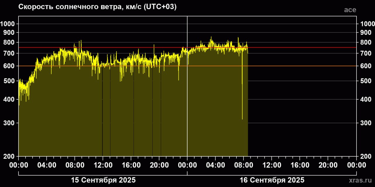 Исключительно высокая скорость солнечного ветра не показывает тенденций к снижению, а, наоборот, растет. С начала суток этот показатель пересек границу 750 км/с.