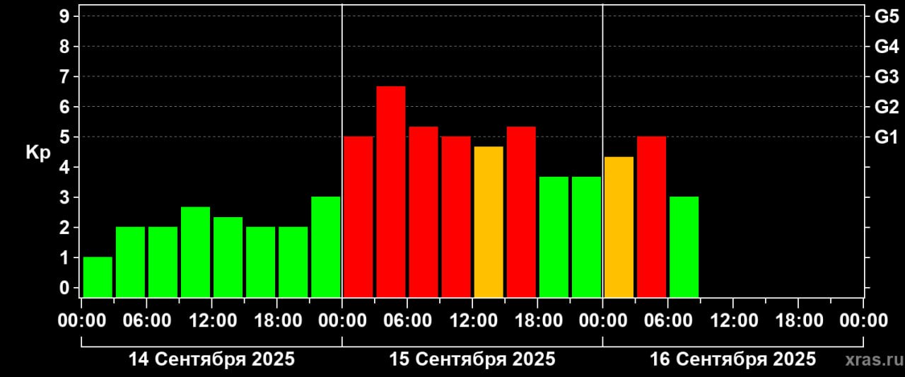 Эксперты лаборатории солнечной астрономии ИКИ РАН сообщают, что 15 сентября буря, классификацией G3 (сильная), началась после того, как Земля пересекла границу крупной корональной дыры на Солнце. Это область с повышенной скоростью солнечного ветра.