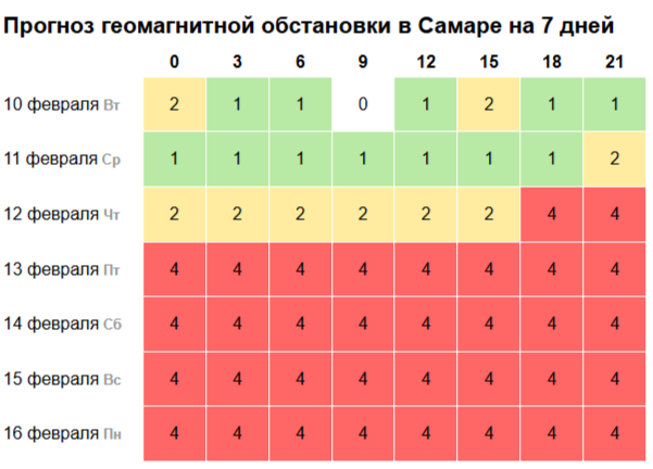 Показатель в 4 балла из 8 возможных зафиксируется в областной столице уже в четверг, 12 февраля. "Малая геомагнитная буря" продержится все выходные и сохранится в Самаре до понедельника, 16 февраля.