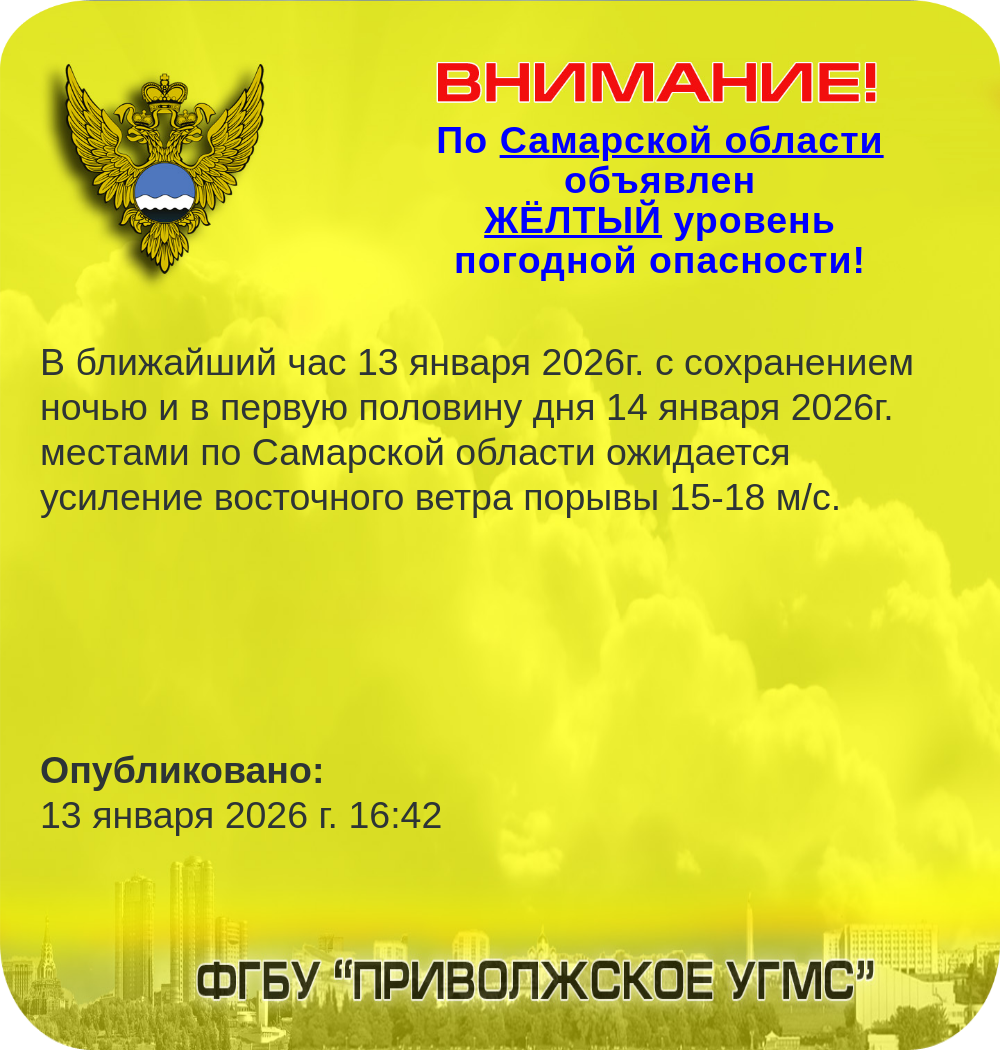 По прогнозам синоптиков, в течение ближайшего часа 13 января 2026 года, а также в ночные и утренние часы 14 января 2026 года, в отдельных районах Самарской области ожидается усиление ветра восточного направления, с порывами достигающими 15-18 метров в секунду.