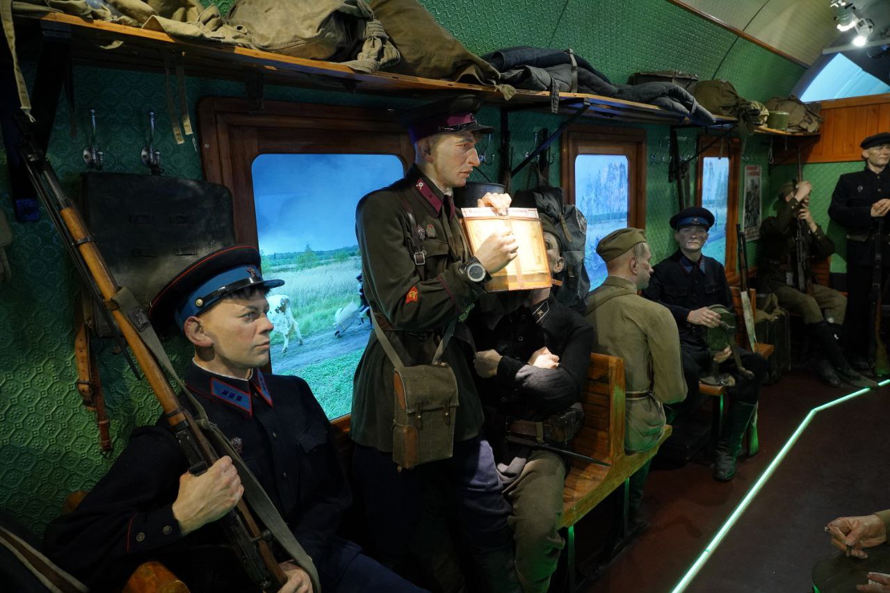 В поезде воссоздана историческая реальность с помощью современных технологий: дополненная реальность, объемный звук и театральное освещение реалистичных фигур. Скульптуры выполнены с портретным сходством: по фотографиям воспроизведены позы, эмоции, выражения лиц.