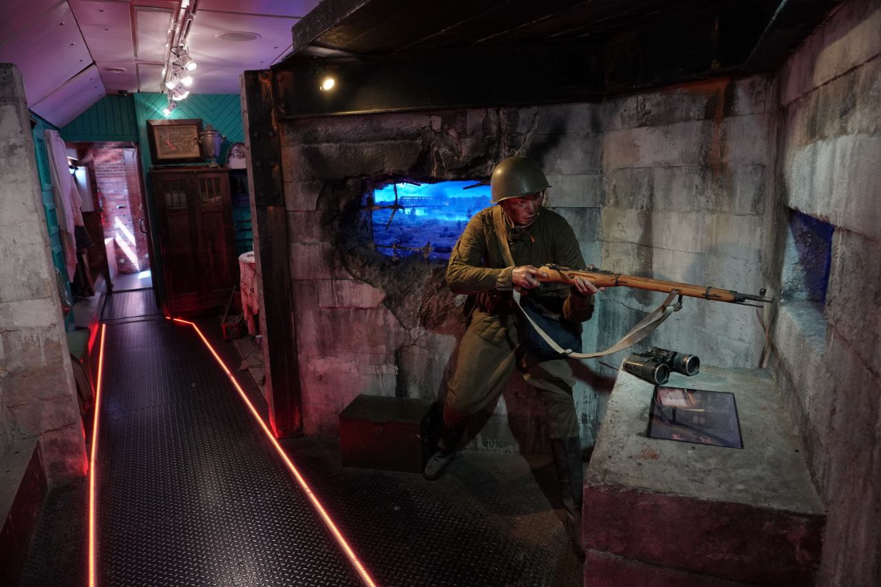 Сперва все посетители погружаются в довоенный июнь 1941 года. Проходя дальше, можно увидеть начало войны и подвиг солдат при обороне Брестской крепости. Плачущая мать – символ всех солдатских матерей – провожает молодых мальчишек на фронт, защищать Родину. Битва за Москву и фрагмент линий укреплений, окопов и траншей на передовой демонстрируют стойкость русского солдата: здесь слышны взрывы, во время которых чувствуется вибрация под ногами.