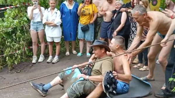 Вспомнив зимние забавы, молодые люди пустили в ход туристические коврики, известные также как "пенки" или сидушки. Превратив их в подобие санок, они лихо скатывались по местным тропинкам, рельеф которых как нельзя лучше подошел для этой необычной затеи. Дождь превратил землю в скользкую поверхность, позволив "санкам" набирать приличную скорость.