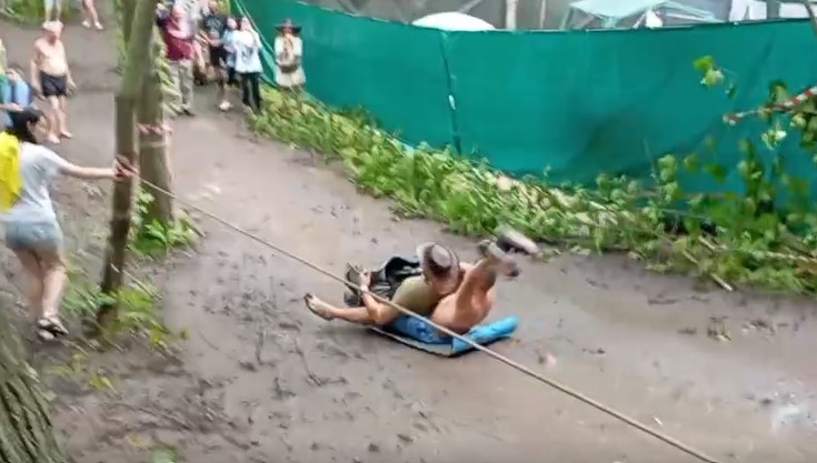 Гости мастрюковской поляны не унывают и находят новые способы развлечься. После обильных осадков участники фестиваля превратили фестивальную поляну в летнюю саночную трассу.